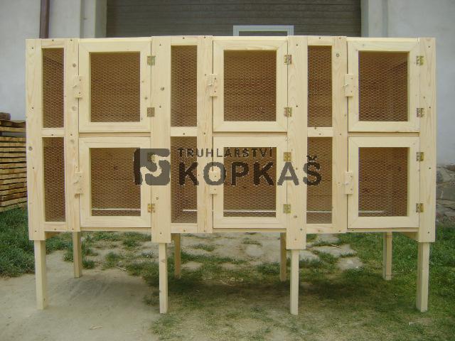 Králíkárna na 6 kotců. Rozměry kotce: výška 50 cm, šířka 70 cm, délka 70 cm. Vyrobeno z prken síly 2 cm a hranolů 7,5 x 3,5 cm. Cena je bez nátěru.