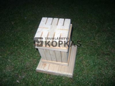 Stojan na nože je vyrobený ze smrku, rozměry 9,5 x 9,5 cm, výška 25 cm.