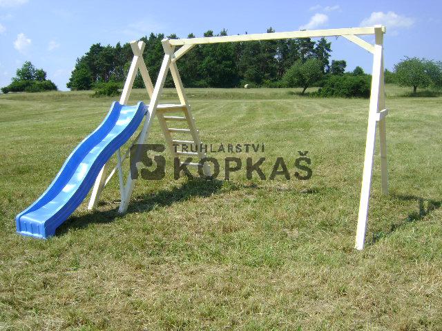 Houpačka se skluzavkou je ideální řešení pro dětský koutek na Vaší zahradě. Sestava nabízí možnost zavěšení až dvou houpaček. Je vyrobena ze smrkového dřeva z hranolů o rozměrech 7,5 x 7,5 cm. Houpačka se skluzavkou je určená pro soukromé pozemky. Povrch dřevěných částí je hoblovaný a broušený.