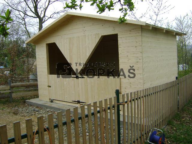 Zahradní domek STÁJ o rozměrech 2,5 x 4 m, vyrobený z palubek síly 1,9 cm a trámů 7,5 x 7,5 cm.