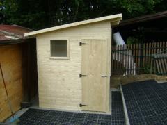 Zahradní domek 2 x 2 m je vyroben z palubek síly 1,9 cm a trámů 7,5 x 7,5 cm.