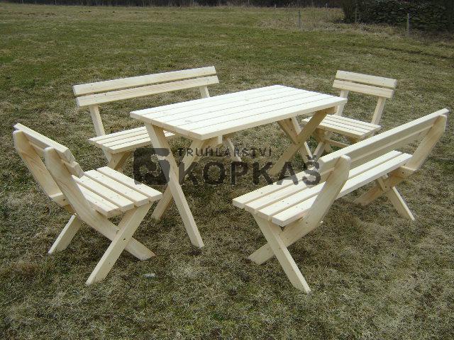 Zahradní set je vyrobený z materiálu síly 3,5 cm a délky 150 cm. Cena je bez nátěru.